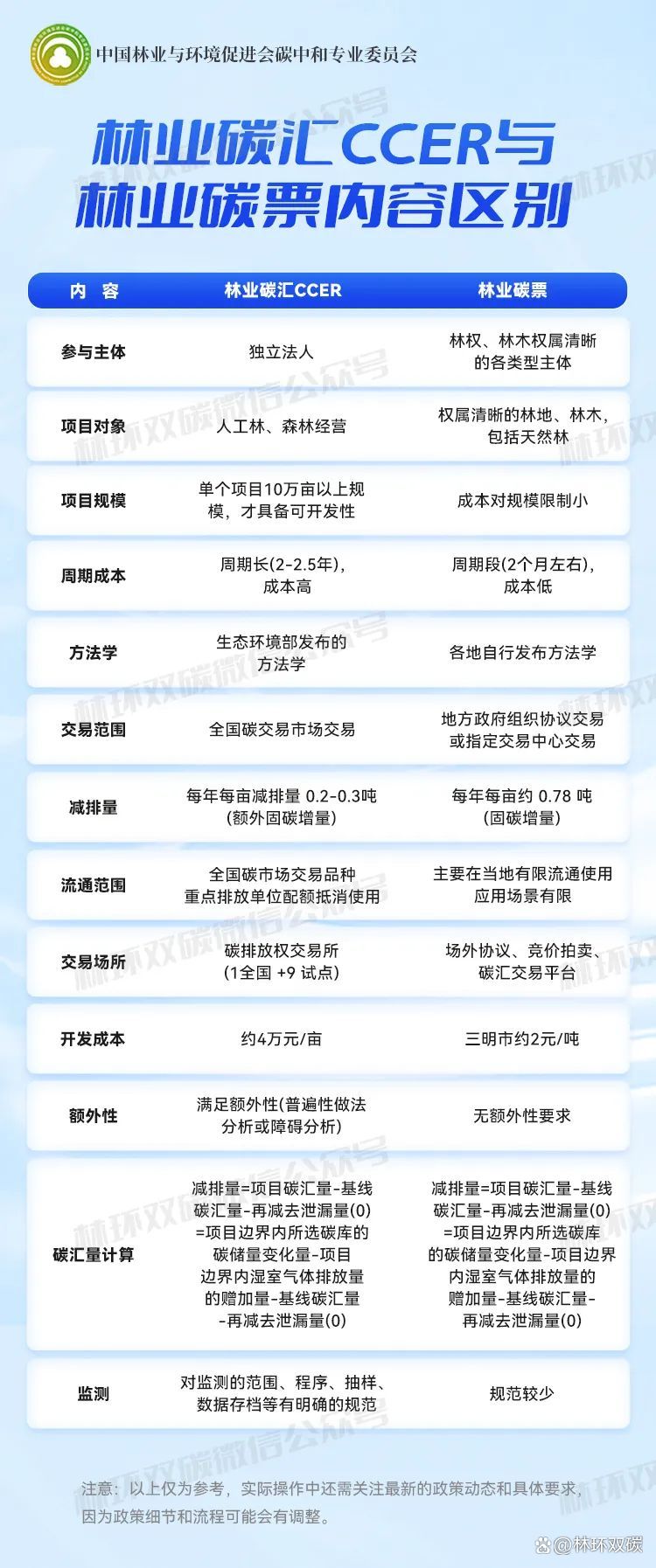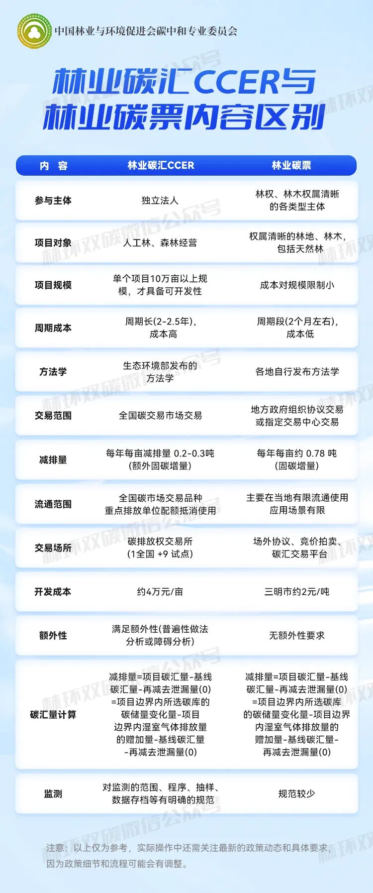 地方性林业碳票方法学强调灵活性和地方特色,适应不同森林资源条件,包括多种林地类型和调整碳汇计量方法。而林业碳汇CCER方法学则遵循严格的国家标准,规定了造林活动的基线、额外性、泄漏风险评估和监测等技术要求。两者在方法学和申请流程上体现了地方实践与国家标准的差异,反映了碳市场多元化发展和项目管理的专业性。