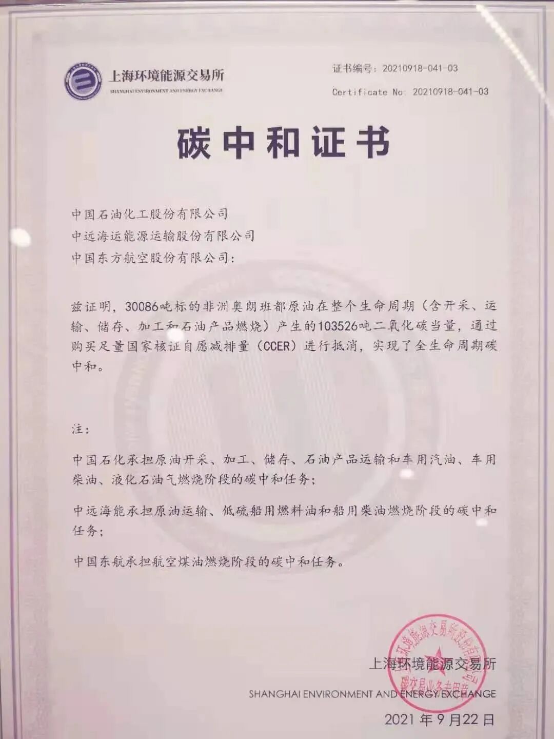 图:上海环境能源交易所开出的我国首张碳中和石油认证书